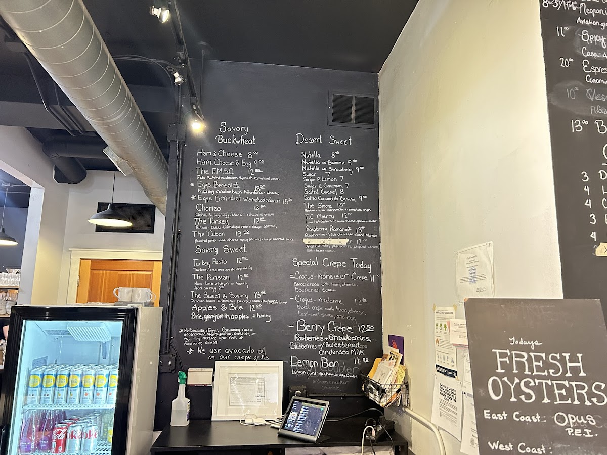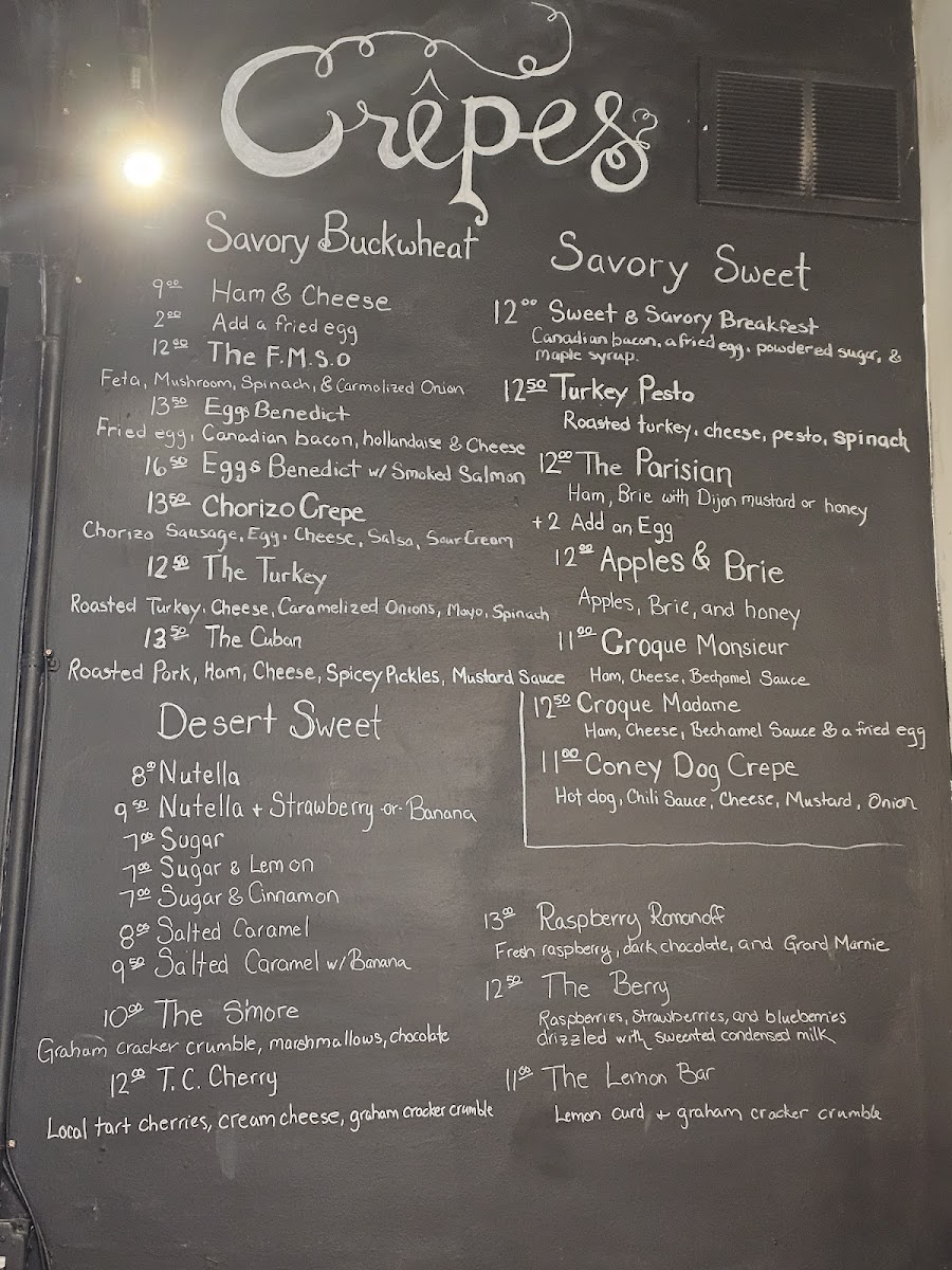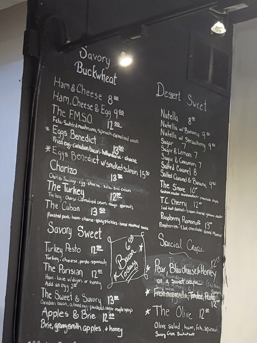 Roasted pork, Ham, gruyere cheese, pickles (spicy or regular) house mustard sauce in a savory buckwheat crepe